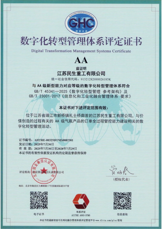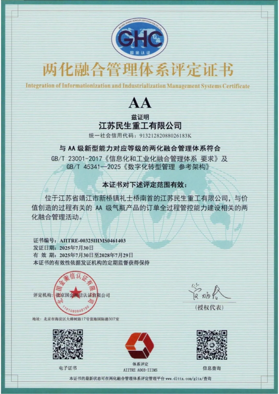 近日,江蘇民生重工有限公司(以下簡稱“民生重工”)順利通過了工業(yè)和信息化部兩化融合管理體系評(píng)定工作委員會(huì)的審核,榮獲《兩化融合管理體系A(chǔ)A級(jí)評(píng)定證書》及《數(shù)字化轉(zhuǎn)型管理體系A(chǔ)A級(jí)評(píng)定證書》。此次雙認(rèn)證標(biāo)志著民生重工在智能制造與信息化深度融合領(lǐng)域?qū)崿F(xiàn)里程碑式突破,為民生重工數(shù)字化轉(zhuǎn)型和管理體系的提質(zhì)增效提供了實(shí)踐范本。